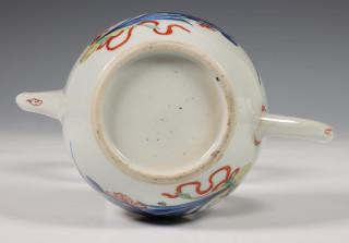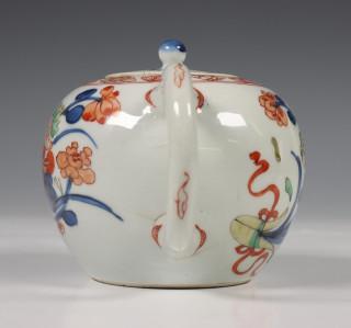 decor van bloemboeketten aan beide zijden met famille verte details (binnenzijde bodem glazuur niet helemaal dekkend, rond de greep haarscheurtjes in het glazuur)