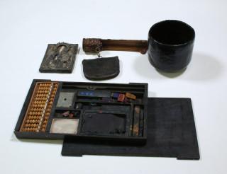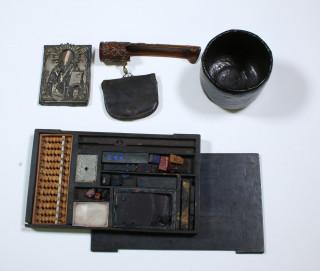 Japan, collection of a earthenware bowl, decorated with a crack, a calculating set, a purse with a wooden holder and one small icon