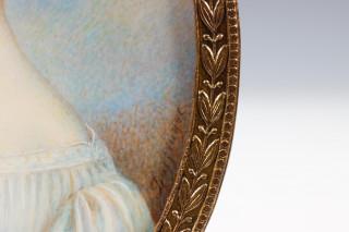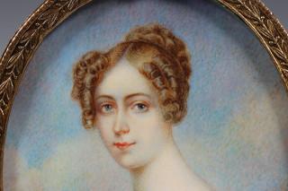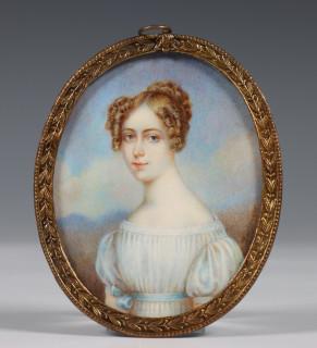 Portrait miniature attributed to Moritz Michael Daffinger, depicting a lady in white dress. Painted on ivory and mounted in a brass frame, 19th century.