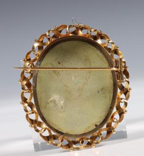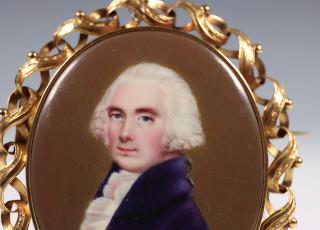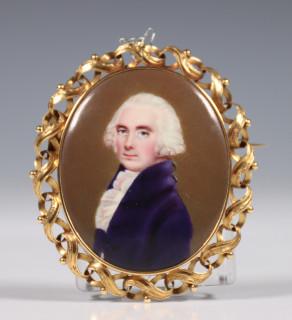 Enameled portrait miniature of a gentleman wearing a purple coat. English school, 19th century. Mounted in a golden brooch frame.