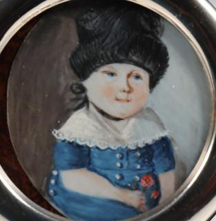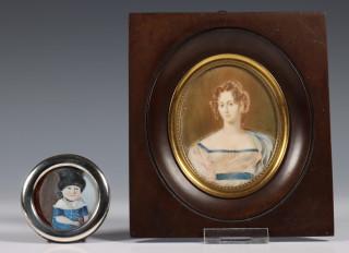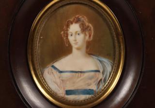 geschilderd op ivoor, monogram 'R.E.', in een houten lijst. Hierbij een portret miniatuur, geschilderd op ivoor (gebarsten) van een jonge dame in witte jurk staande naast een tuinvaas, 19e eeuw, niet ingelijst. En een portret miniatuur van een meisje met een blauwe hoed, 19e eeuw, in een modern zilveren lijstje.