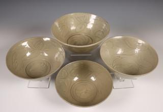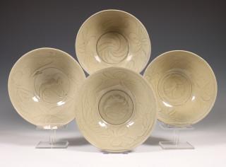China, four celadon porcelain bowls, Northern Sung dynasty, 10th-12th century, incised with flowing floral pattern, from the Jepara wreck, Java Sea