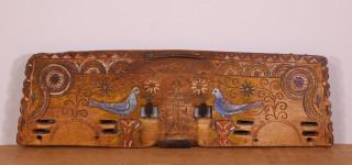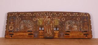 met centraal een voorstelling van een boer geflankeerd door ossenkoppen, scenes met putti, bloem en blad motieven. Aan de andere zijde een kruis en vogels. Polychroom geschilderd.