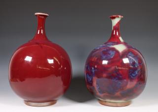 een vaas bedekt met egaal koperrood glazuur, de ander met paars, lichtgroen en rood gevlekt glazuur, beide met apocrief vierkarakter merk