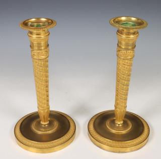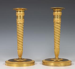 Frankrijk, paar vuurvergulde bronzen éénlichts kandelaars, Empire.