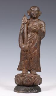 staande op een lotussokkel, met staf en bedelnap in zijn handen (enkele beschadigingen)