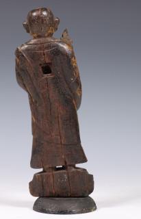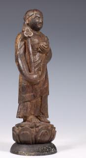 China, standing wood figure of Buddha, 19th century, standing on a lotus base, holding a staff and alms bowl (some damages)