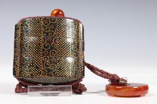 gedecoreerd in goudblad en groene schelp met geometrische motieven, met agaten manju en ojime (enkele beschadigingen)