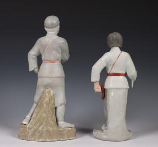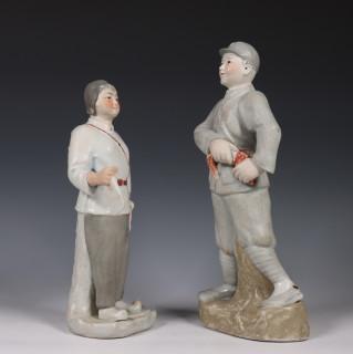China, pair of porcelain figures of workers, second half 20th century, the man and woman both wearing communist attire, modelled after propaganda figures