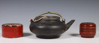 China, 2 lakwerk doosjes en eenYixing theepot, 20e eeuw,