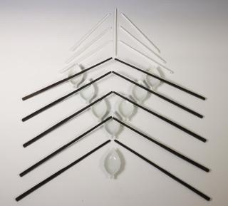 tien houten en zeven porseleinen eetstokjes, samen met acht bladvormige sojasausschaaltjes