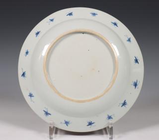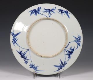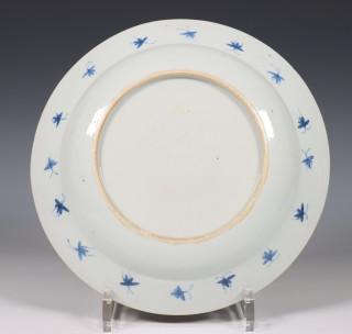 het paar Imari borden naar een ontwerp van Cornelis Pronk, een blauw-wit bord gedecoreerd met qylin en een blauw-wit bord met vogels en bloemen (haarlijn, kleine chip)