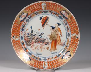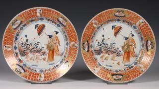 China, een paar Imari 'Parasoldames' borden en twee blauw-wit porseleinen borden, voornamelijk 20e eeuw,