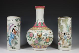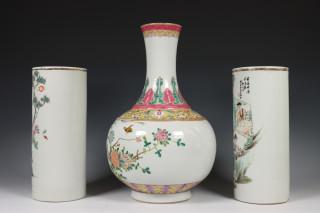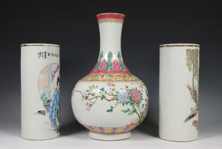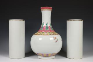 China, twee famille rose cilindervazen en een flesvormige vaas, 20e eeuw,