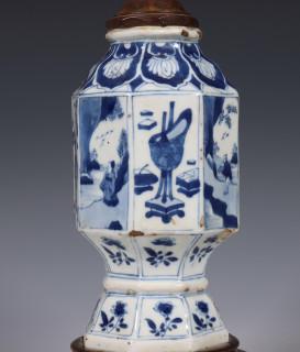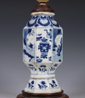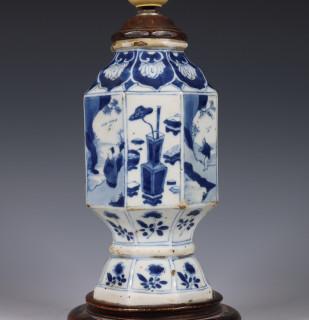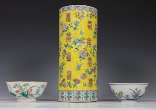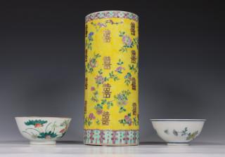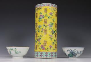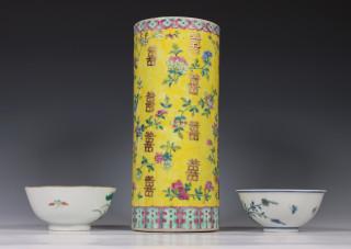 bestaande uit een blauw-wit achtkantig Kangxi vaasje gemonteerd als lamp, een geelgegronde cilindervaas gedecoreerd met bloemen en shou-karakters, en twee kommen verschillend gedecoreerd met lotus en planten (kleine restauraties, frits and chips)