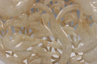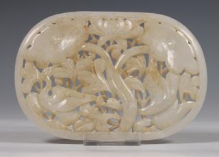 China, oval jade plaque, 19th-20th century, openworked and carved with geese among flowers, the stone of a creamy white tone (small chips)