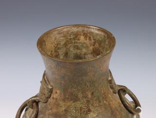 China, bronze archaistic vase, possibly 19th century, cast with a horizontal band met stylised phoenixes, the neck with two mask-and-ring handles, with inscription