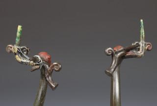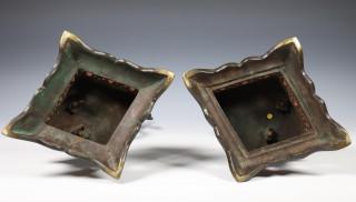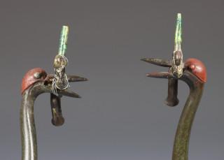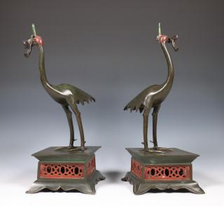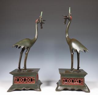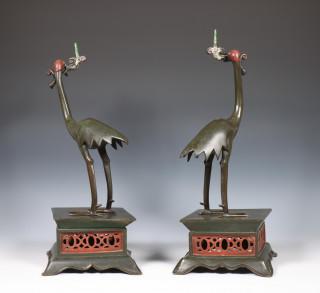 China, een paar bronzen kaarsenhouders in de vorm van kraanvogels, 20e eeuw,