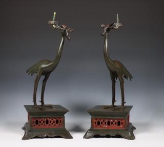 China, a pair of bronze candle-holders in the shape of cranes, 20th century, each on lozenge-shaped stand, the bids holding a pricket candlestick in their beaks (one holder broken)