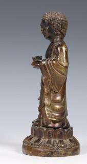 China/Tibet, standing bronze figure of Buddha, possibly ca. 1800, standing on a double lotus, his left hand holding a lotus and dressed in long robes