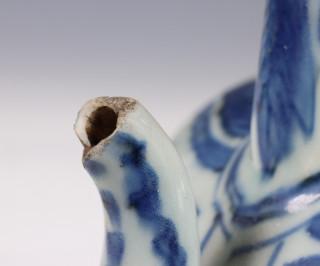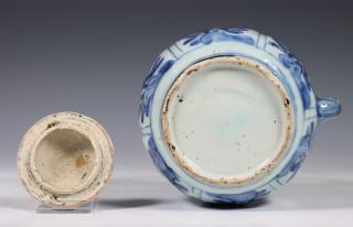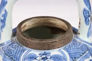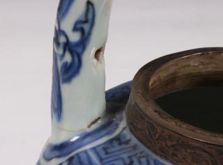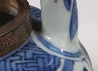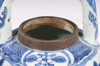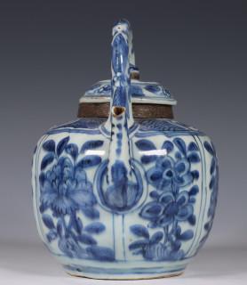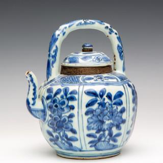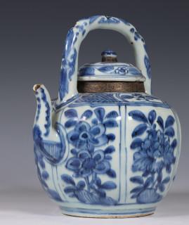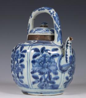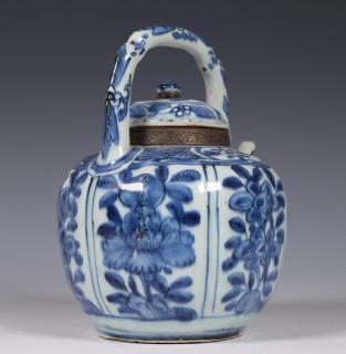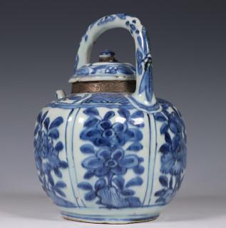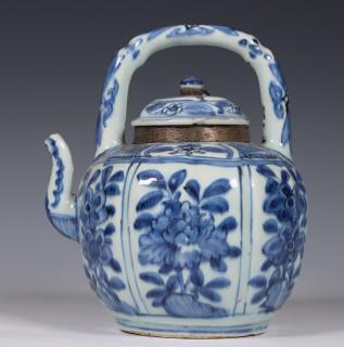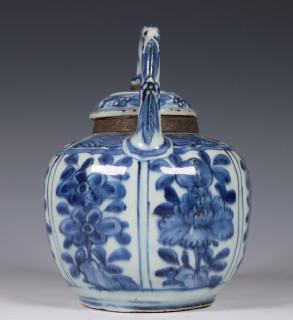 China, blue and white porcelain winepot, Wanli, decorated with floral panels, with overhead handle and with later silver mount (chip to spout, hairline)