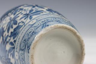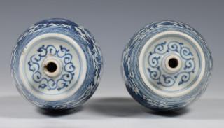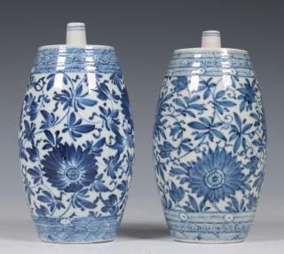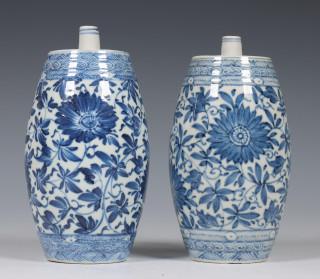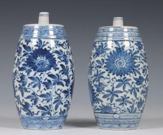 China, paar blauw-wit porseleinen tonvormige drankvaatjes, Kangxi,