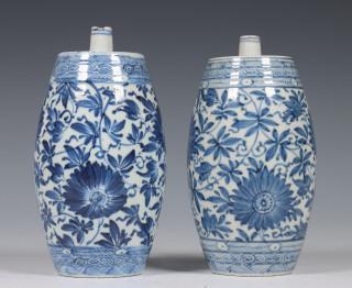 China, pair of blue and white porcelain wine-barrels, Kangxi, painted with flowers (one with repaired and damaged spout, one with small chip to foot)