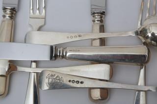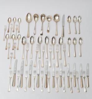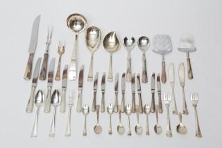 bestaande uit zes dinercouverts, vijf dinervorken, zes dessert couverts, zes dinermessen en zes dessert messen, zes taartvorkjes en koffielepels, vijf divers diverse opdienlepels,( niet alle Haags-lof ) samengesteld, 1e en 2e gehalte, hierbij divers bijpassende pleet dinergerei,