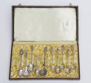 mt. PS en 800st gemerkt, hierbij vijf diverse lepels waarvan drie met bekroning van melkemmers dragende figuren met juk, in etui,