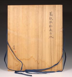 Japan, Hiroyuki, a large glazed stoneware dish, Showa period, with green dripping glaze and abstract decoration, in original wood box