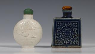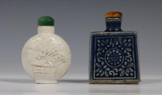 China, two porcelain snuff bottles, 20th century, one rounded bottle in biscuit and moulded with a pavilion on one and a fishing boat on the other side, the rectangular bottle blue-glazed and decorated with flowers