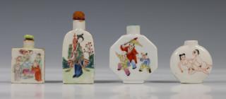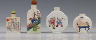 China, four figural porcelain snuff bottles, one decorated with figures in a garden, one with erotic scenes, one with figures near an altar and one with boys, the last two with apocryphal Qianlong marks (small chips)