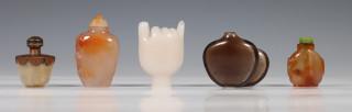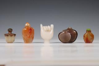 bestaande uit een wit jade flesje in de vorm van Boeddha's hand, een agaat flesje gesneden met vogel op magnoliatak, een rookglazen dubbelflesje, een achtkantig gemonteerd flesje en een agaat flesje gesneden met grepen (enkele beschadigingen)