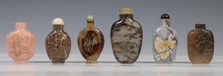 China, collection of snuff bottles, comprising a hair crystal bottle, an agate bottle, a rosequartz bottle with floral decoration, two various stone bottles and one faux stone bottle