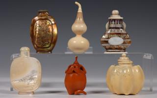China, collection of snuff bottles, 19th-20th century, comprising an ivory melon-shaped bottle, an ivory double-gourd bottle, an imitation amber fruit-shaped bottle and three various mother-of-pearl bottles (some damages)