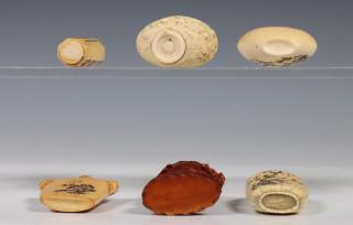 China, collection of ivory snuff bottles, 19th-20th century, comprising a bottle carved with boys in a landscape, three bottles with figures in relief and two painted bottles (minor chips)