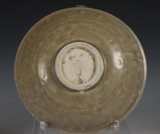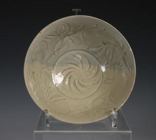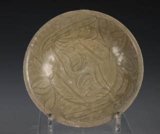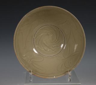 China, two celadon porcelain bowls and a dish, Northern Sung dynasty, 10th-12th century, all with incised flowing floral decoration and covered with a greyish green glaze (small nicks), from the Jepara wreck, Java Sea