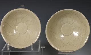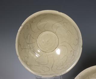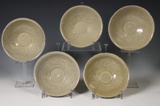 China, five celadon porcelain bowls, Northern Sung dynasty, 10th-12 century, each decorated with flowing stylised decoration, covered with a greyish green glaze (chip, glaze crack), from the Jepara wreck, Java Sea