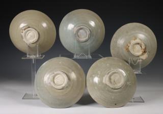 China, three and two celadon porcelain bowls, Northern Sung dynasty, 10th-12th century, incised with stylised floral decoration, covered in a greyish green glaze (frits), from the Jepara wreck, Java Sea