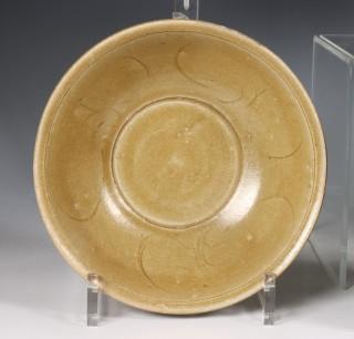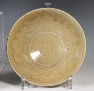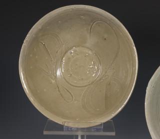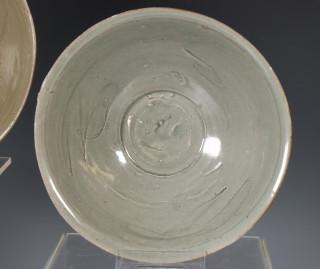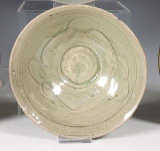 China, five celadon porcelain bowls, Northern Sung dynasty, 10th-12th century, each variously incised with flowing stylised decoration, the glaze varying from bluish green to yellowish green, from the Jepara wreck, Java Sea