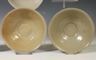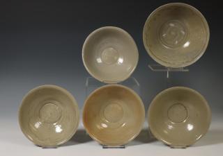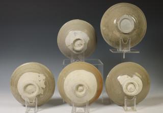 China, five celadon porcelain bowls, Northern Sung dynasty, 10th-12th century, plain, covered with a greyish green to yellowish green glaze, from the Jepara wreck, Java sea