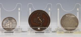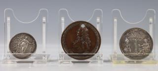 Drie penningen, Beloningspenning doortocht van stadhouder Willem IV in Amsterdam, 1747; Liefdadigheidspenning, 1781; Penning op de Verheffing van Prins Willem IV tot stadhouder, 1747
