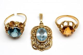 Alle bezet met een gekleurde gefacetteerde edelsteen. Eén ring doorgeknipt.