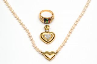Ring bezet met smaragd, robijn, saffier en diamanten. Hanger pavé bezet met diamant