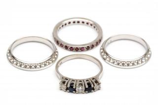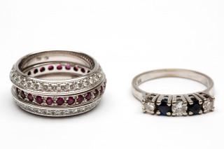 Hierbij een18 kt. alliancering en een 14 kt. rijring. Aanschuifringen bezet met briljant geslepen diamanten, alliancering bezet met robijnen, rijring bezet met saffieren en diamanten