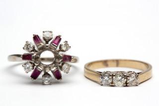 bezet met drie briljant geslepen diamanten (grote chip bij de middelste en zijsteen) en een entouragering (middelste steen ontbreekt)