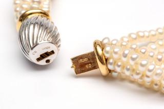 Zeven strengen zoetwater parelcollier aan witgouden geribde sluiting