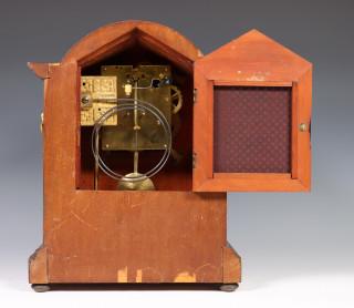 Mahoniehouten tafelklok met wit emaille wijzerplaat, ca. 1900.