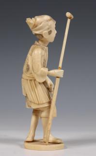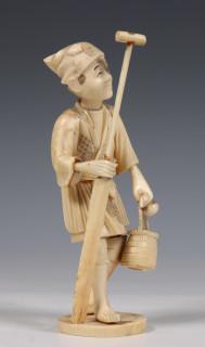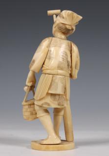 Japan, ivory okimono of a fisherman with peddle and basket, Meiji period, signed to the base (some damages and repair)