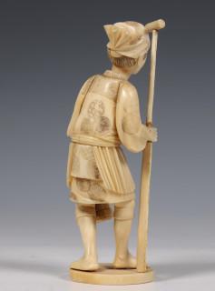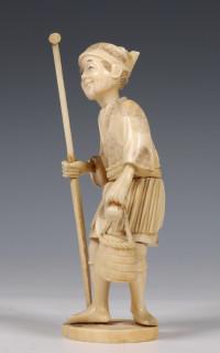 Japan, ivoren okimono van visser met peddel en mandje, Meiji periode,